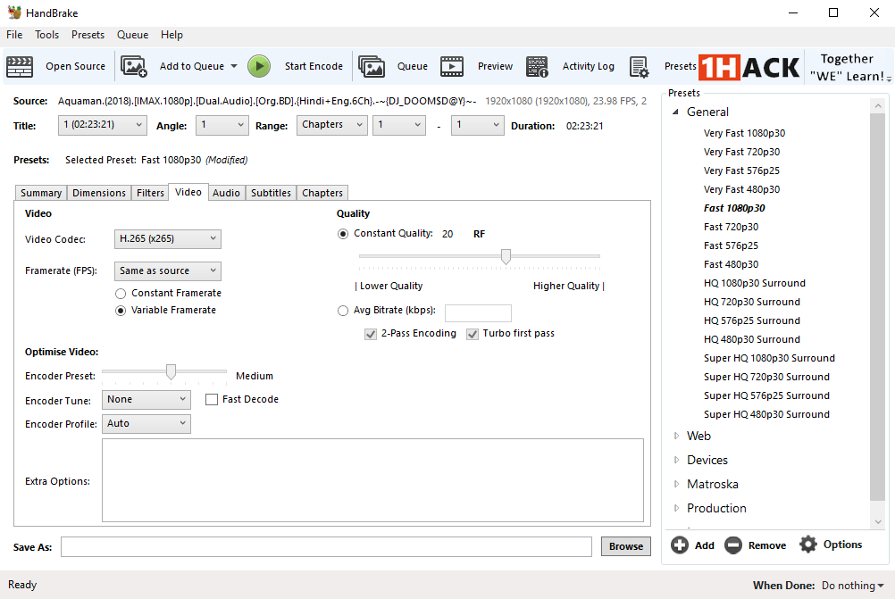 Quality : If you want to convert x264 to x265 with reduced file size, just keep constant quality at 20, 21 or 22. This will deliver great quality with acceptable size. Otherwise, 23 will be a great balance between quality and file size especially for 1080p videos.