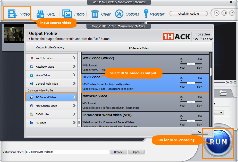 Firstly, Free download and install WinX HD Video Converter Deluxe on your PC or Mac (free download Mac version) to get ready for the H.265 conversion task.