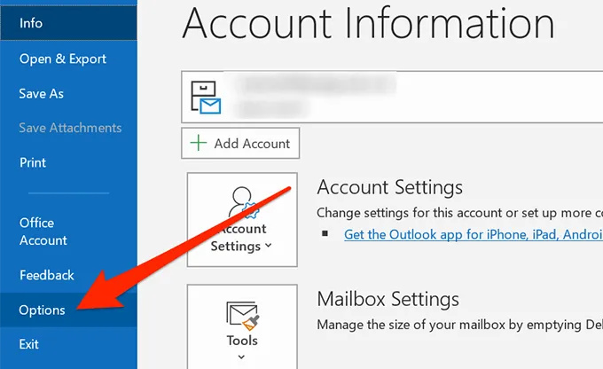 - Launch Outlook on your computer, click on the File tab at the top, and click on Options in the left sidebar.