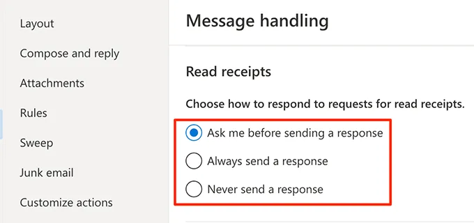 - Scroll down to the Read receipts section and you’ll find three options that let you define how read receipts should be dealt with. These are exactly the same options you found in the Outlook for desktop version.