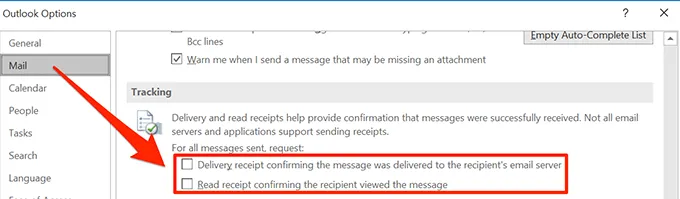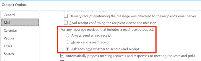 - Scroll down to the Tracking section and look towards the subsection that says For any message received that includes a read receipt request .