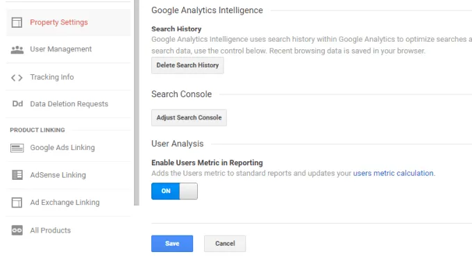 - The last feature you’ll want to enable in the Google Analytics Property Settings is at the bottom of the Property Settings page. Under User Analysis, you’ll see a setting for Enable Users Metric in Reporting .
