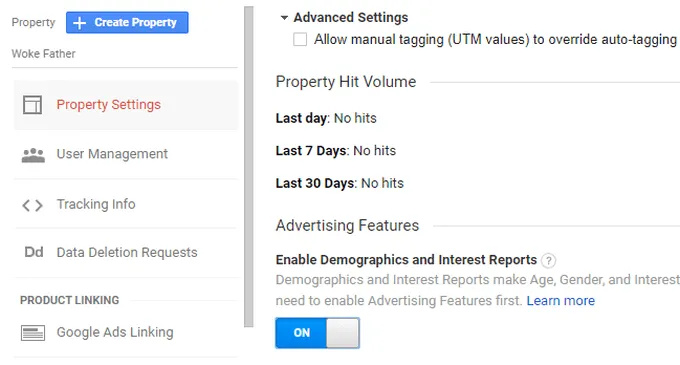 - Scroll down to the Advertising Features section and under Enable Demographics and Interest Reports , set the setting to ON .