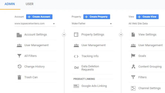 - To see these features, log into your Google Analytics account, go to Administration and open the account you’ve created.