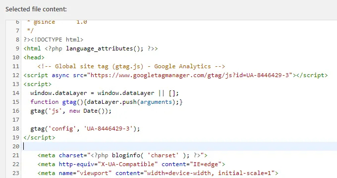 In the editor window, find the tag and insert the Google Analytics text after it.
