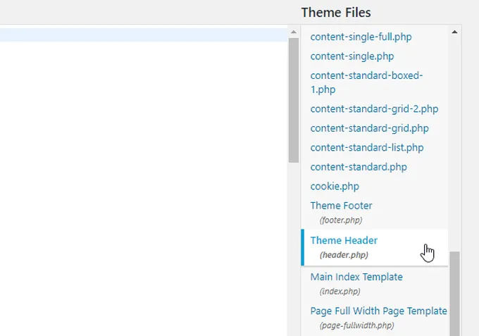 Typically, most WordPress themes include a Theme Header ( header.php ). In the Theme Editor window, select this from the list of theme files.