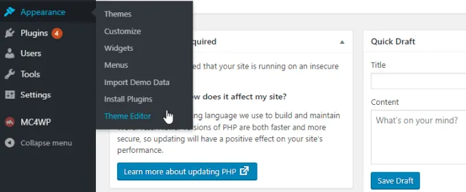 - Open your website’s WordPress dashboard, select Appearance from the left navigation menu, and choose Theme Editor from the menu.
