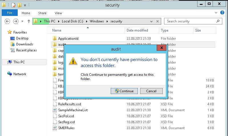 What it looks like: let’s try to open a system folder C:\Windows\security\audit in Windows Explorer. User Account Control window appears to warn that you cannot access this folder ( You don’t currently have permission to access this folder ). But you can get access by clicking Continue.