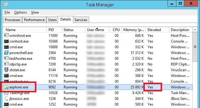 You can make sure that Windows Explorer is running elevated in the Task Manager . Start it, and go to the Details tab. Right-click any column, click Select columns and enable Elevated column to be displayed. As you can see, explorer.exe is now having attribute Elevated=Yes .