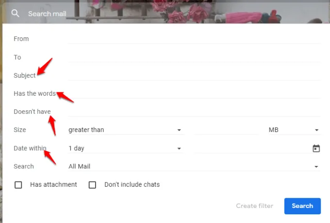 - If you prefer to sort your emails by subject, instead of sender or labels, you can do that easily by typing some relevant words in the Has the words field.