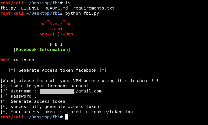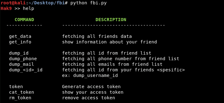 Before dumping the information we need to connect our Facebook account(not recommended to use your primary Facebook account) with the tool. To do that type β token β on the terminal to generate the access token as seen on the screenshot given below.