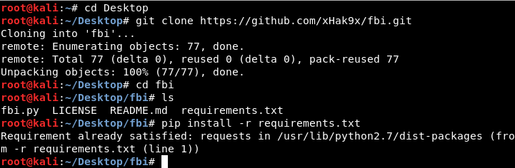 Here you will see a python script named β fbi.py β which will be used to launch the tool but before proceeding to that we have to satisfy some requirements. Run the β requirements.txt β file by using the command given below.