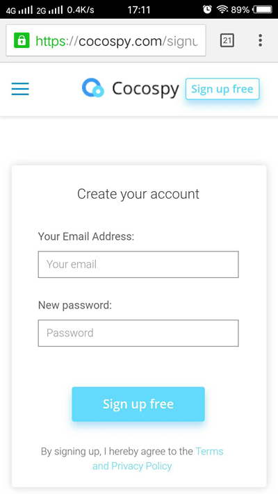 Open your web browser on a PC or any device, visit the official site of Cocospy and Sign up for Cocospy’s account using email and password.
