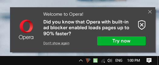The prompt had a “try now” and a “don’t show again” option, and a close button attached to it. I only ever saw Opera advertising features of its own products using the notification system.