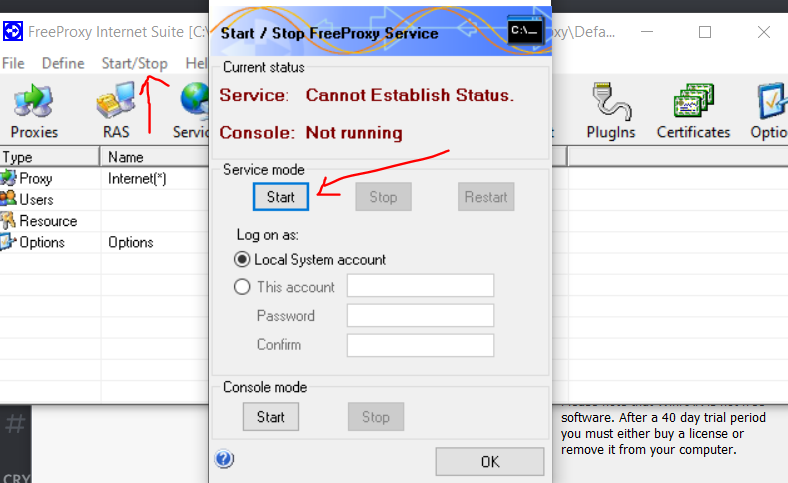 7 . Click Start/Stop, and Start under Service Mode