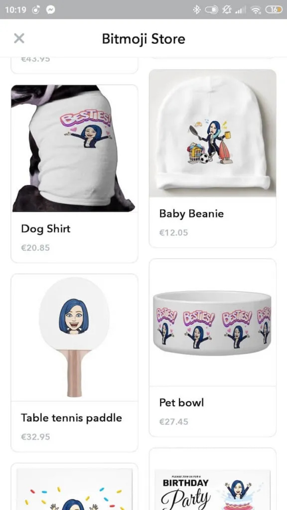 Bitmoji store has all kinds of merch that you can buy, starting from a simple T-shirt with your personalized sticker and finishing with a table tennis paddle with your cartoon face on it. So next time you’re struggling to find a quirky gift for a friend or a family member – have a browse on the Bitmoji app and see if anything catches your eye.