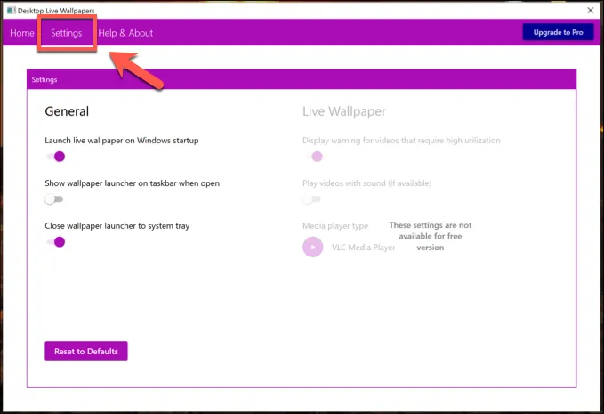 To change your playback settings, click the Settings tab. From here, you can change the boot-up launch options, preferred background video player, and other playback options (including the ability to disable sound).