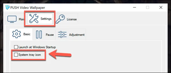 To hide your Push Video Wallpapers window from view, you can minimize it. You can also add it as a system tray icon (hiding it to the notifications area in your taskbar) by clicking Settings > Basic > System Tray Icon .