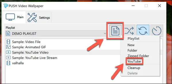 If you want to use a YouTube playlist for video wallpapers, click the Playlist icon in the top-right, then select YouTube from the drop-down menu.