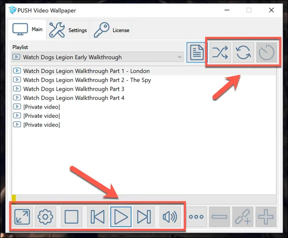 You can control your Push Video Wallpapers playlist using the options at the bottom of the window, with standard video playback options to play, pause, skip, and more. You can also set your playlist to repeat and randomize using the options in the top-right corner.