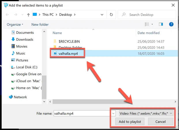 In the selection window, locate your video or GIF files. You may need to switch between Video Files and Image Files in the file type drop-down menu in the bottom-right. Once you’ve selected your content, click Add to Playlist to add it to your playlist.