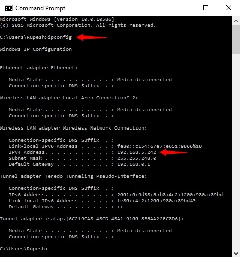 2. If the internet is working fine, you will have to go to command prompt and check your connections’ IPv4 address using “ipconfig” command , since the “auto locate” feature does not work in this method.