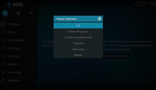 The power button on the left side lets you exit Kodi , reboot and offers other similar functions.