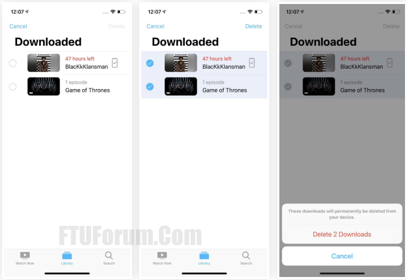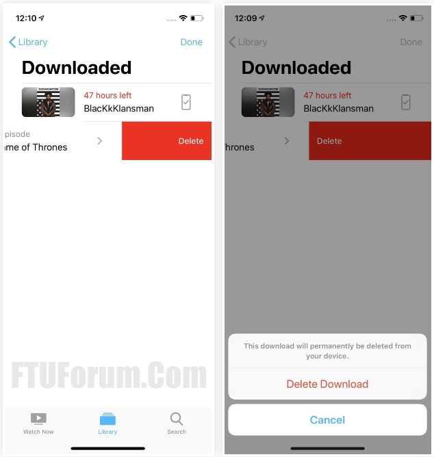 Alternatively, you can delete titles, episodes, and even entire TV series by swiping left quickly on each. If you don’t swipe fast enough, tap the “Delete” button. Either way, touch the “Delete Download” confirmation to finish.