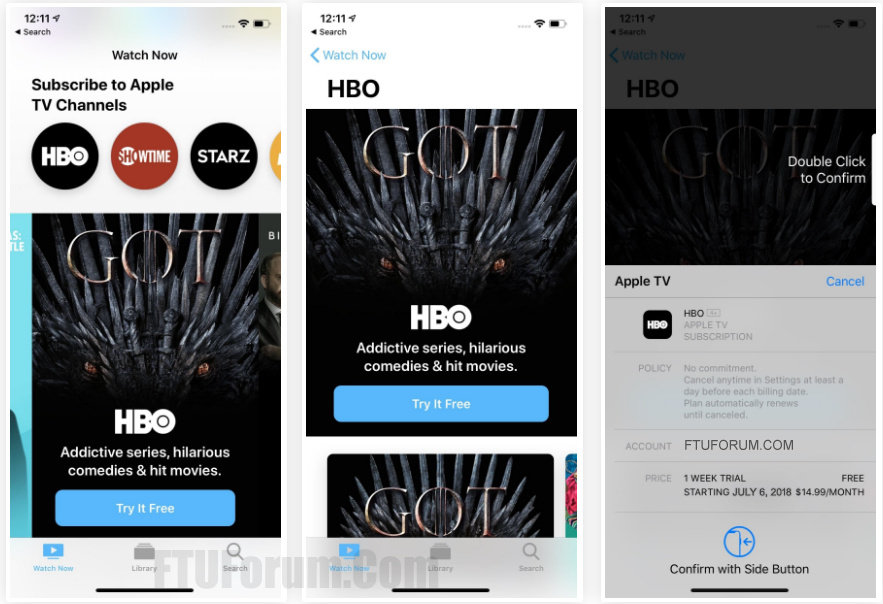 All you need to do is tap “Try It Free.” Once you do, the purchase screen will appear, informing you that when your trial ends, you’ll be charged $14.99 for a monthly subscription to HBO starting on the date mentioned. If you cancel before then, you won’t have to pay, but if you don’t, you’ll at least have to pay for one month of HBO via the card attached to your Apple account.