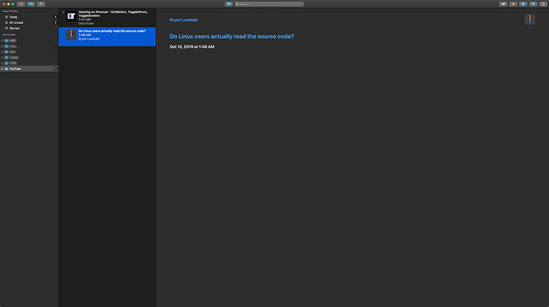 Now let’s say you don’t want to go the invidio.us/FreeTube route. You’re happy with your YouTube RSS subscriptions. That’s totally fine, but the point here is to never reach YouTube again. So how do you watch those RSS videos?