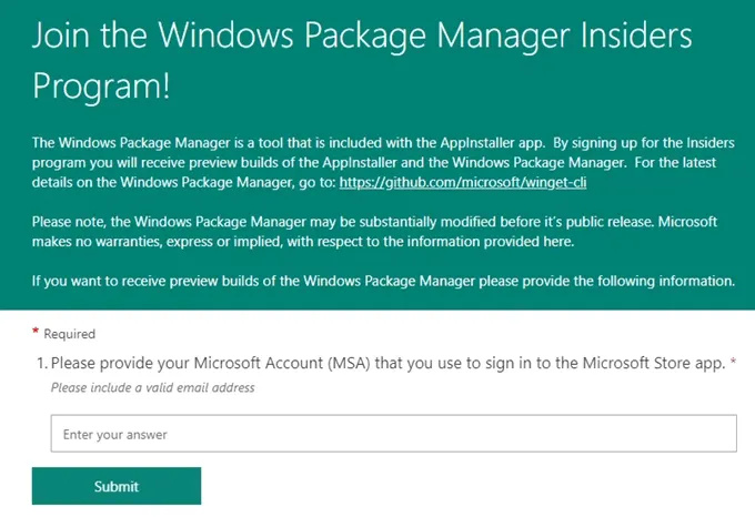 To go this route, you must install the Insider Build for Windows 10 and sign up for the Windows Package Manager Insider Program. This will require you to have a Microsoft Account], like the one you may use to sign into the Microsoft Store app. An email will be sent letting you know if you’re in or not. It takes about 3 days.