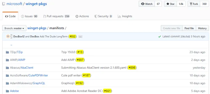 A full list of packages is also available at https://github.com/microsoft/winget-pkgs/tree/master/manifests.
