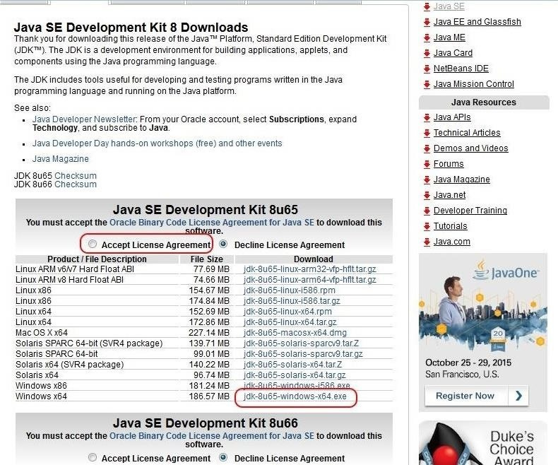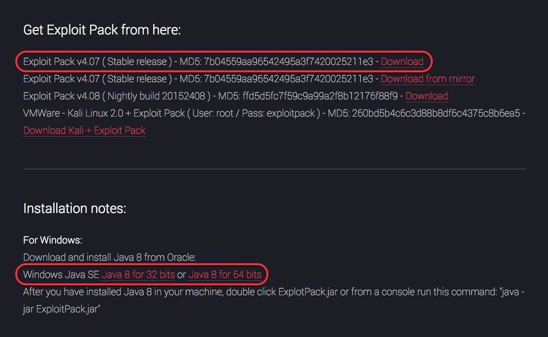 The first step, of course, is to download and install Exploit Pack. As I mentioned above, it is written in Java, so it is requisite that you have Java 8 installed. You can go to Oracle’s website and download Java 8 for your architecture. Since I will be working on a 64-bit Windows 7 system, I downloaded the Windows x64 Java, as circled in the screenshot below.