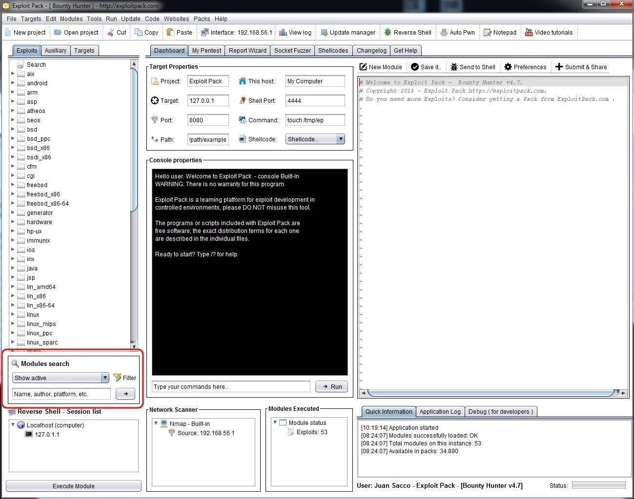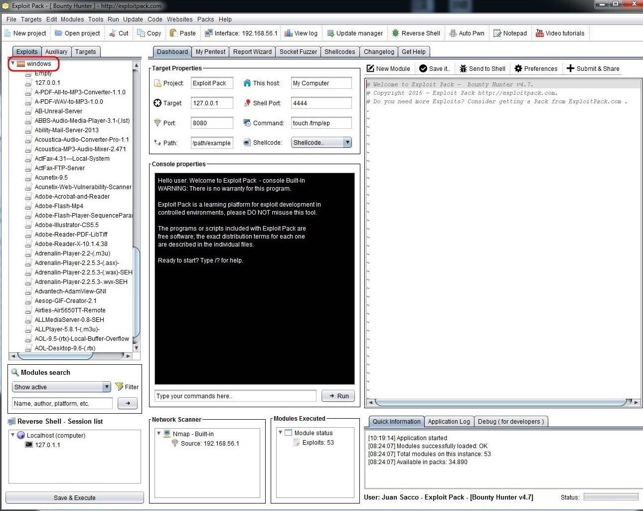 Exploit Pack, developed by Juan Sacco, is similar to Metasploit but written in Java. Besides its universality and easy-to-use GUI, Exploit Pack allows you to develop exploits in the language of your choice (Metasploit exploits must be written in Ruby). We will examine that at a later time.