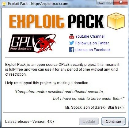 Click on “Continue” when this you see this splash screen to open the Exploit Pack GUI.