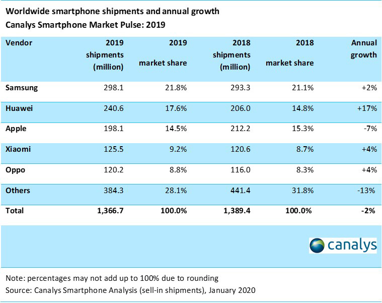 - “For what it’s worth, Canalys has Q4 2019 as Huawei’s first quarterly decline – down seven percent from Q3 – in two years, which it blames on the [Trump Administration’s Huawei export ban],” adds Ars. “Together with the annual Apple Q4 surge thanks to the launch of a new iPhone, Huawei fell to third place again within that time period.”