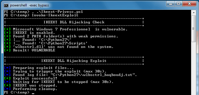 - Invoke-IkeextExploit – If the machine is vulnerable, exploit it by dropping a specifically crafted DLL to the first weak folder.