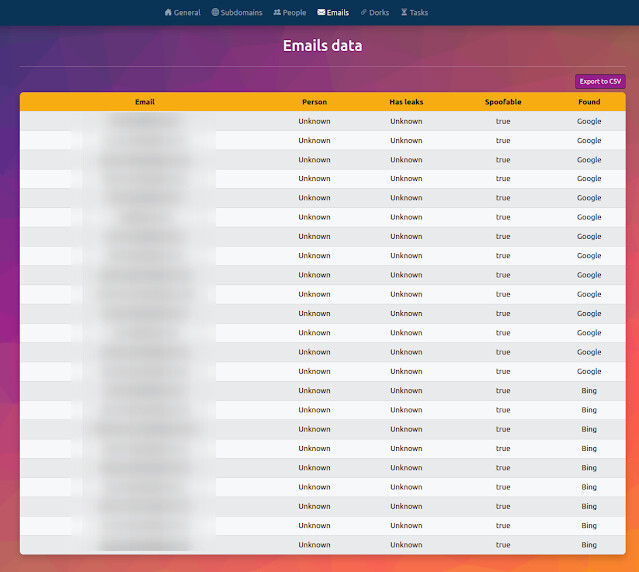During the reconnaissance phase, an attacker searches for any information about his target to create a profile that will later help him to identify possible ways to get in an organization. InfoHound performs passive analysis techniques (which do not interact directly with the target) using OSINT to extract a large amount of data given a web domain name. This tool will retrieve emails, people, files, subdomains, usernames and urls that will be later analyzed to extract even more valuable information.