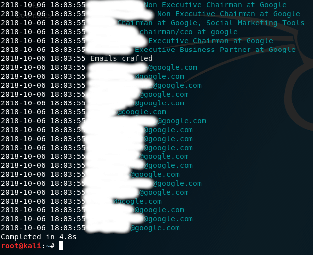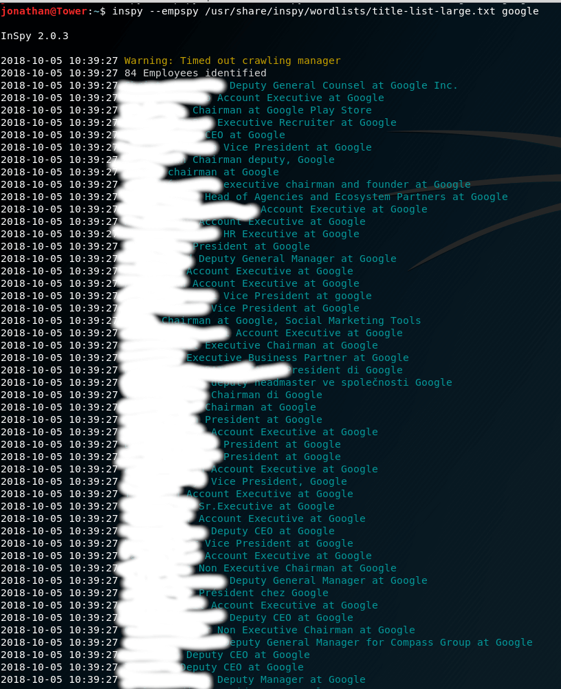 EmpSpy crawls LinkedIn for employees working at the provided company. InSpy searches for employees by title and/or department from a newline-delimited file. InSpy may also create emails for the identified employees if the user specifies an email format.