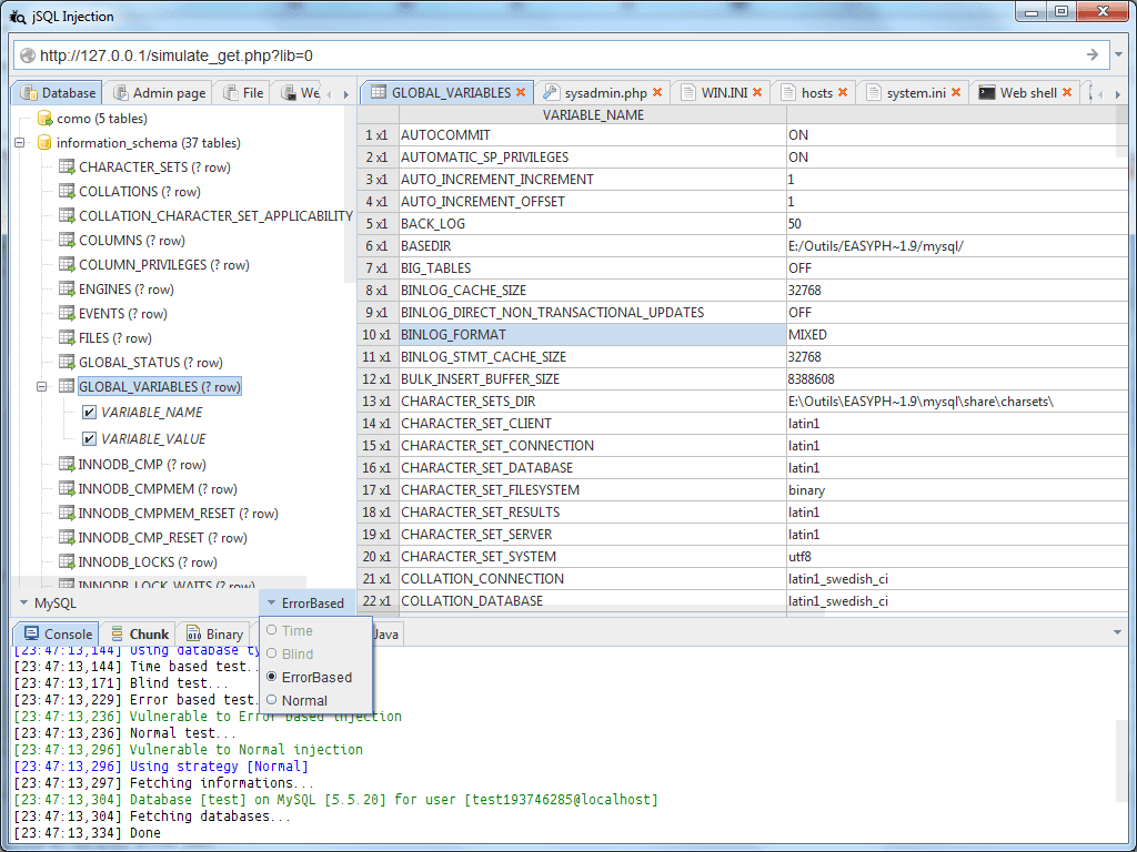 jSQL Injection is a Java application for automatic SQL database injection with multiple injection strategies and also inject webshell and also lightweight application used to find database information from a distant server.