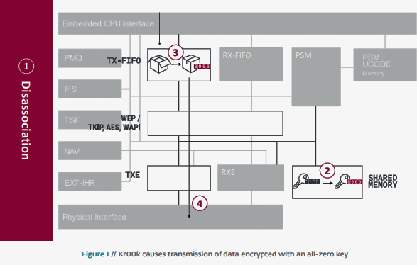 Generally, packets are encrypted with a unique key based on the Wi-Fi network password. When a device disassociated from the Wi-Fi network, with the vulnerable chips keys are zeroed out and then buffered data sent with zero encryption.