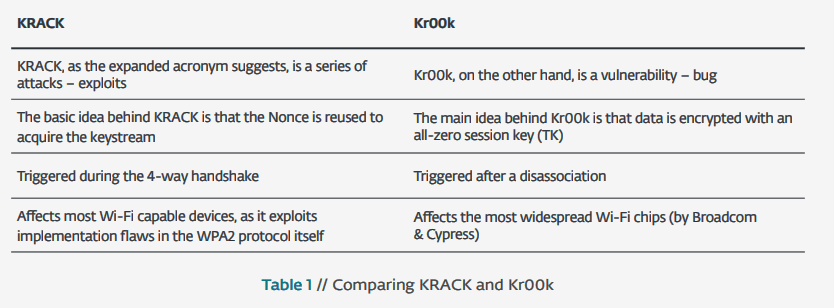 Kr00k also related to KRACK vulnerability which was founded in 2017. “Kr00k is one of the possible reasons behind the “reinstallation” of an all-zero TK, which has been observed while testing for KRACK attacks.”