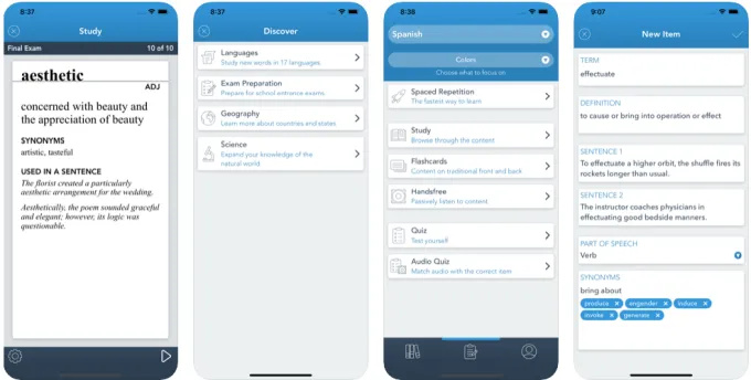 AccelaStudy Essential apps is a simple to use platform that offers an app for each language you want to learn. The words in the apps vary, but all the features are the same, and you get to learn using flashcards, spaced repetition, audio quizzes, and more while building your study based on what you want to focus on.