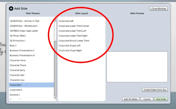 After you click Add Slide , you will see the options shown in the screenshot below.