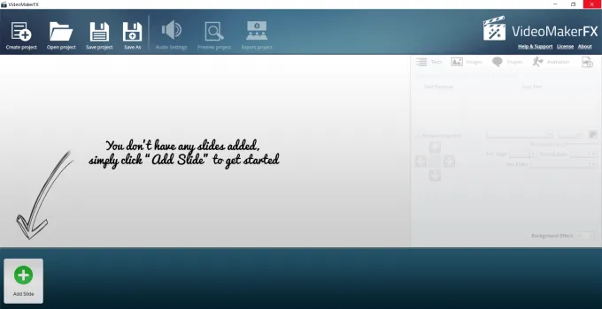 After you create your project, the screen shows you that you don’t have any slides added . Simply click Add Slide to get started.