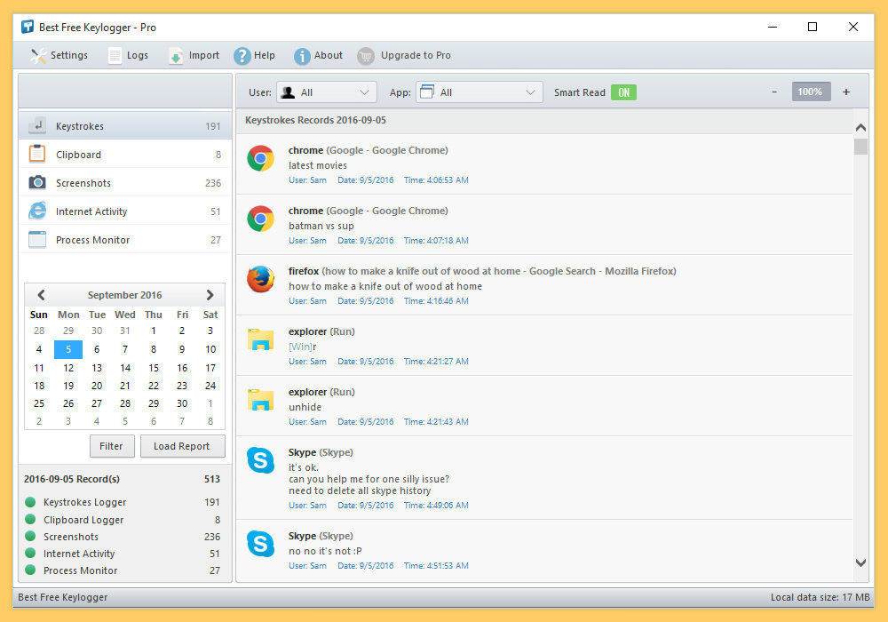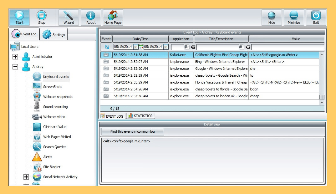 - Keystrokes, websites, chat, applications, keylogging filter, clipboard monitoring, boot events, passwords, and URL history