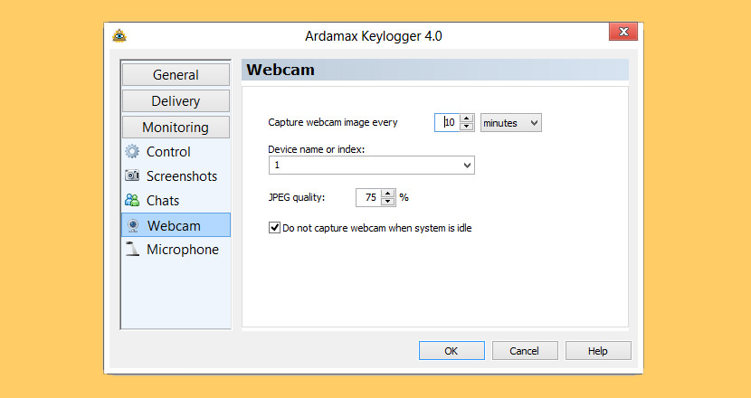 - Webcam recording – Periodically makes webcam pictures and stores them to log.