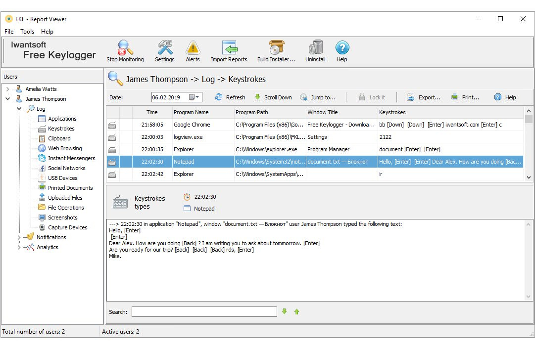 The program is equally suitable for home and work use. At home, it can be used by parents looking to identify potential threats to their children. At work it may be interested for employers making sure their business secrets are not leaked to competitors.