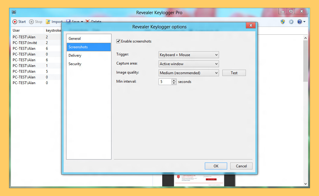 - Visual surveillance – Periodically makes screenshots and stores the compressed images to log.