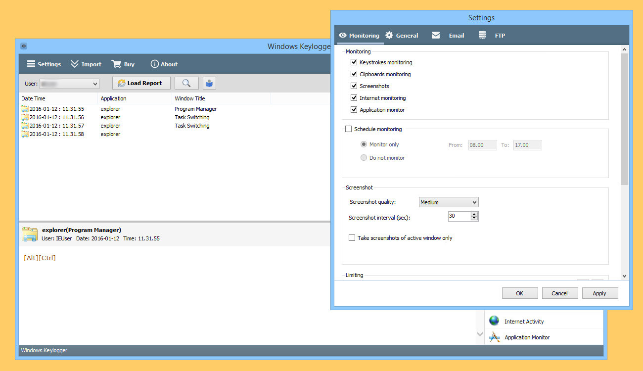 - It can be configured to monitor selected users and to monitor only in selected applications.